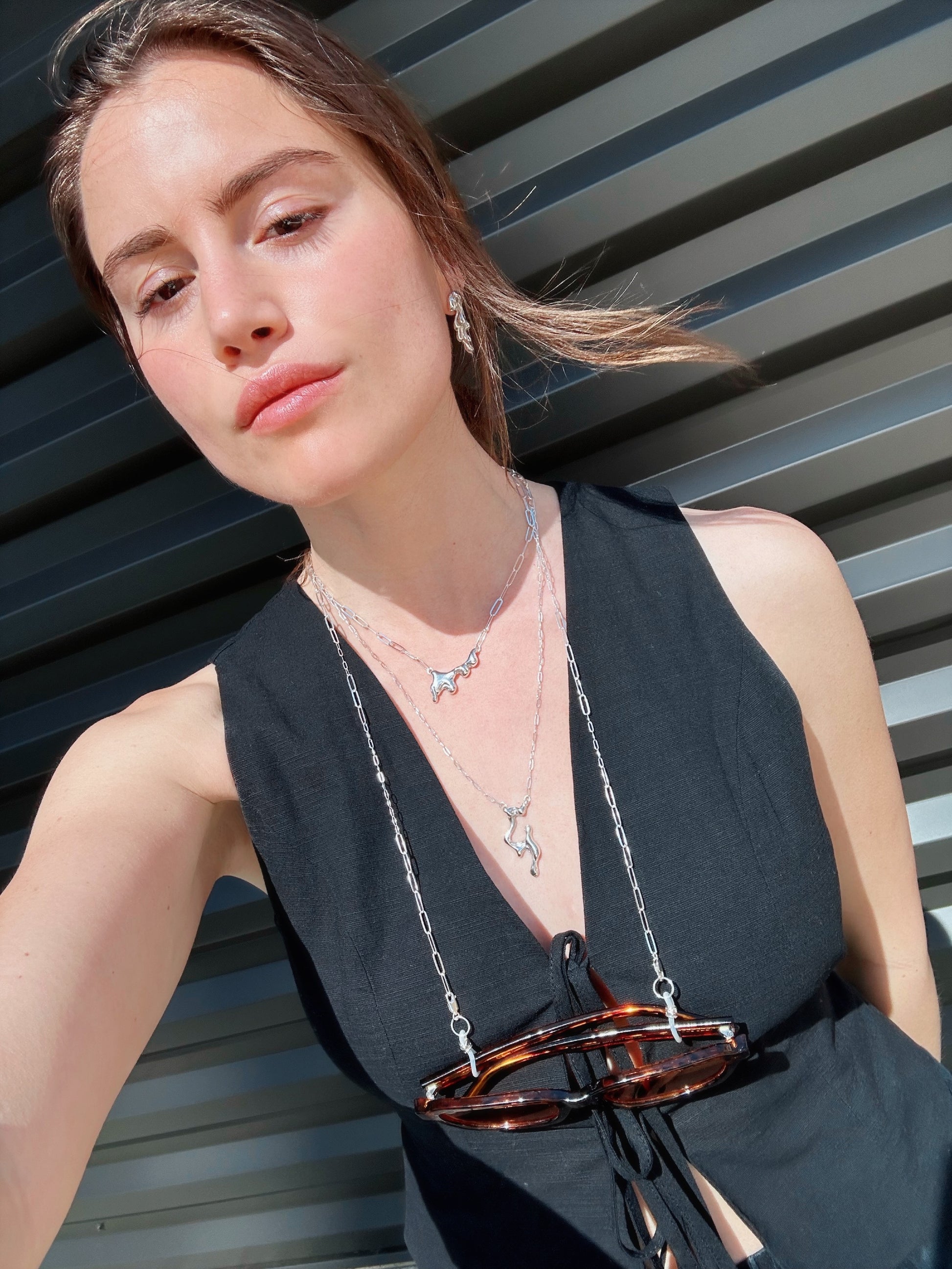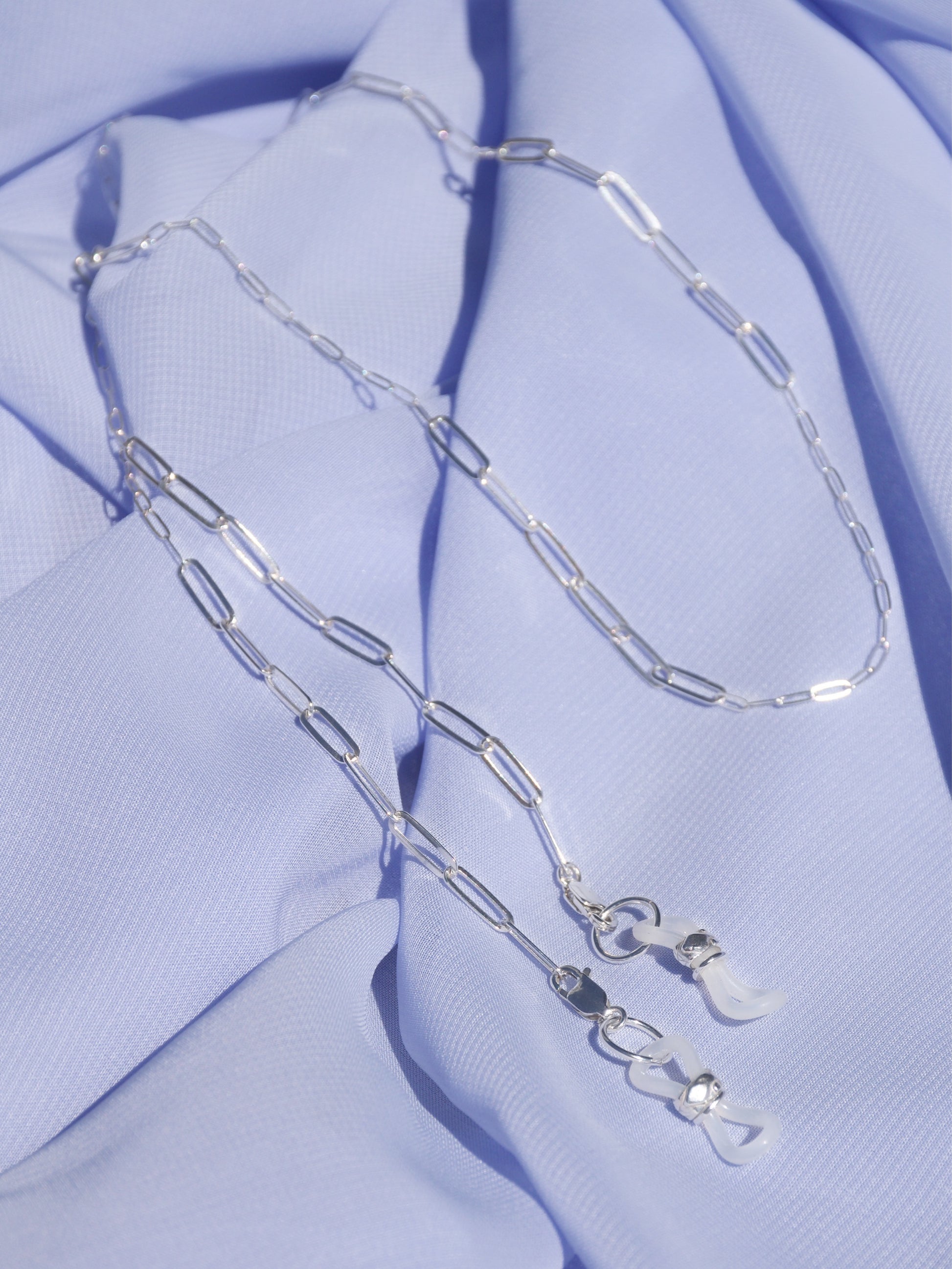 Chain and sizing rings are solid sterling silver. Glasses holders are silicone.