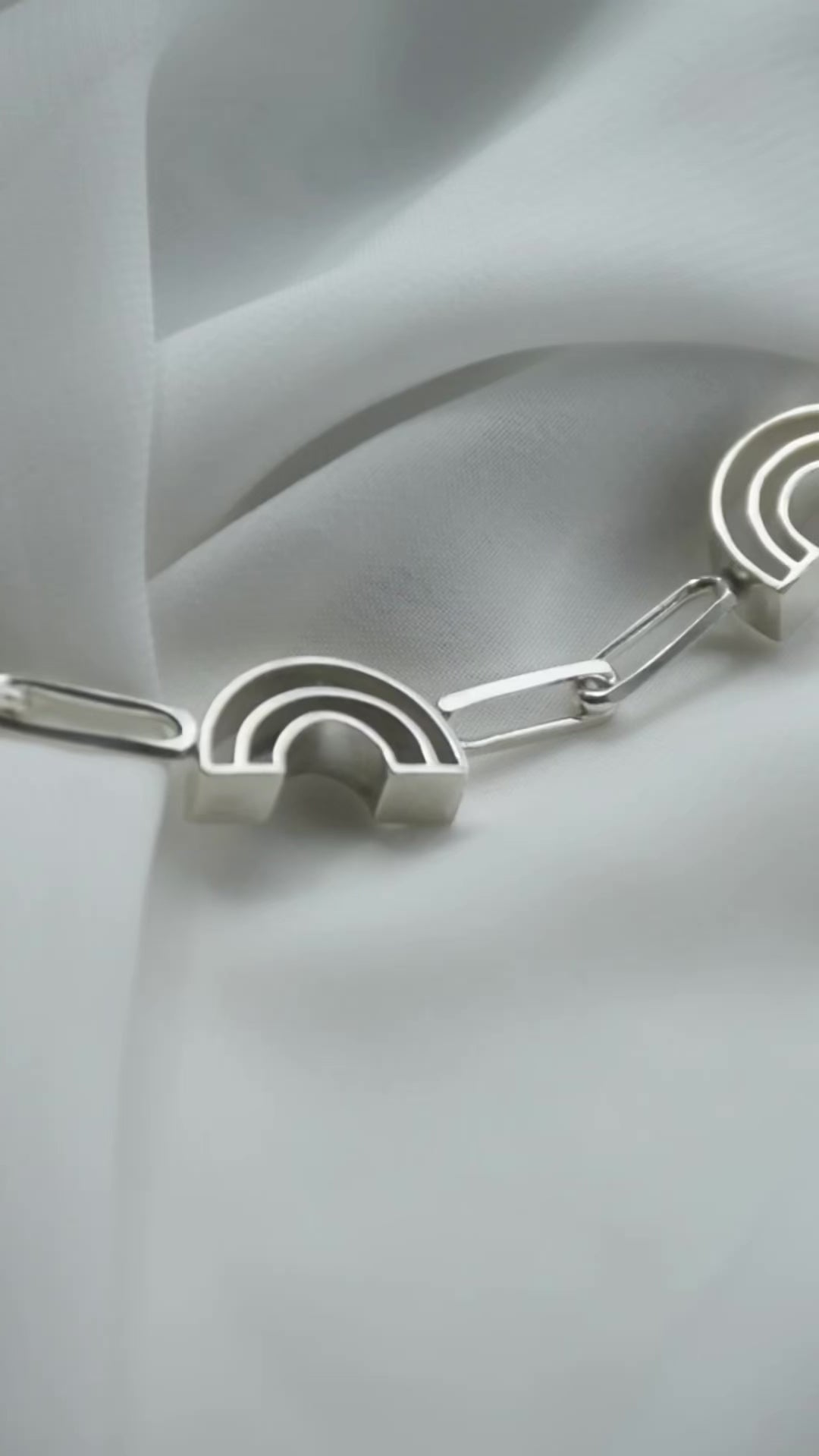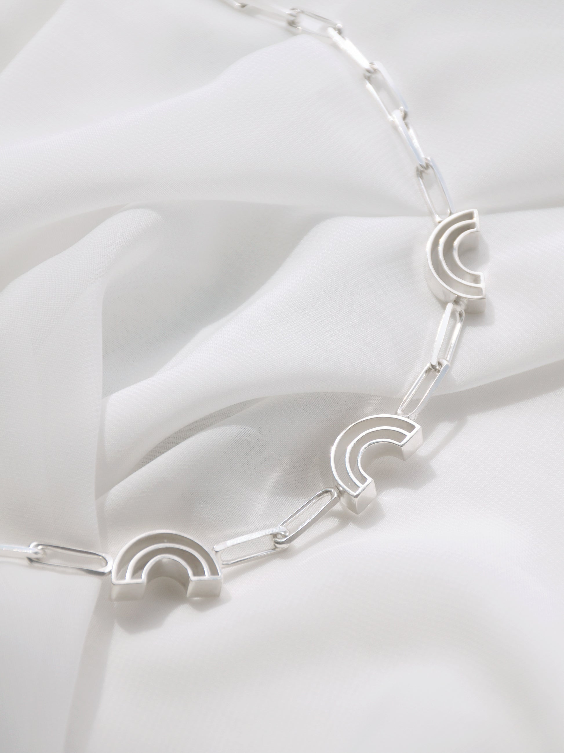The Marsha & Sylvia Set pairs two powerful pieces: the Marsha Necklace and the Sylvia Half Hoops. Handcrafted in solid sterling silver, both designs feature our signature 3D rainbow forms—clean, architectural arcs that catch the light and command attention.