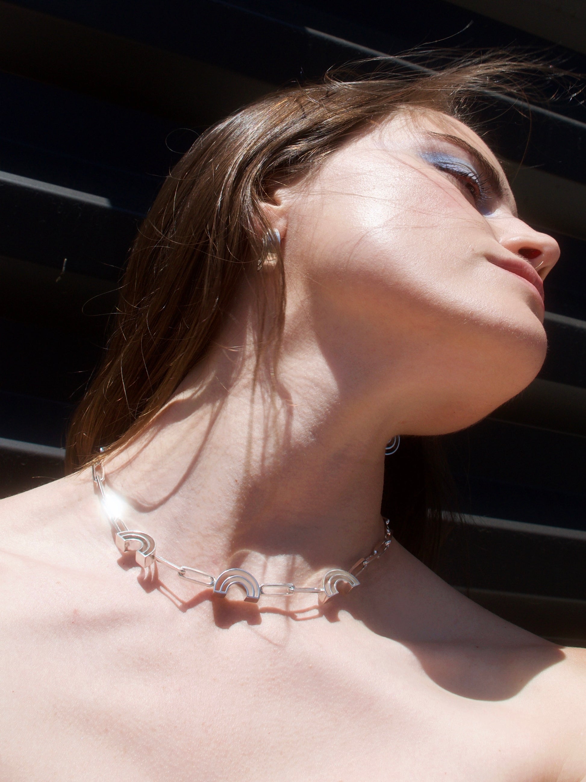 Named after Marsha P. Johnson and Sylvia Rivera—two revolutionary figures at the heart of the Stonewall uprising—this set honors the legacy of queer and trans activism. The Marsha Necklace features three sculptural rainbows soldered to a thick paperclip chain, made to sit proudly just above the collarbone. The Sylvia Half Hoops echo the same form, revealing a rainbow profile from the side while keeping a sleek, powerful silhouette from the front.