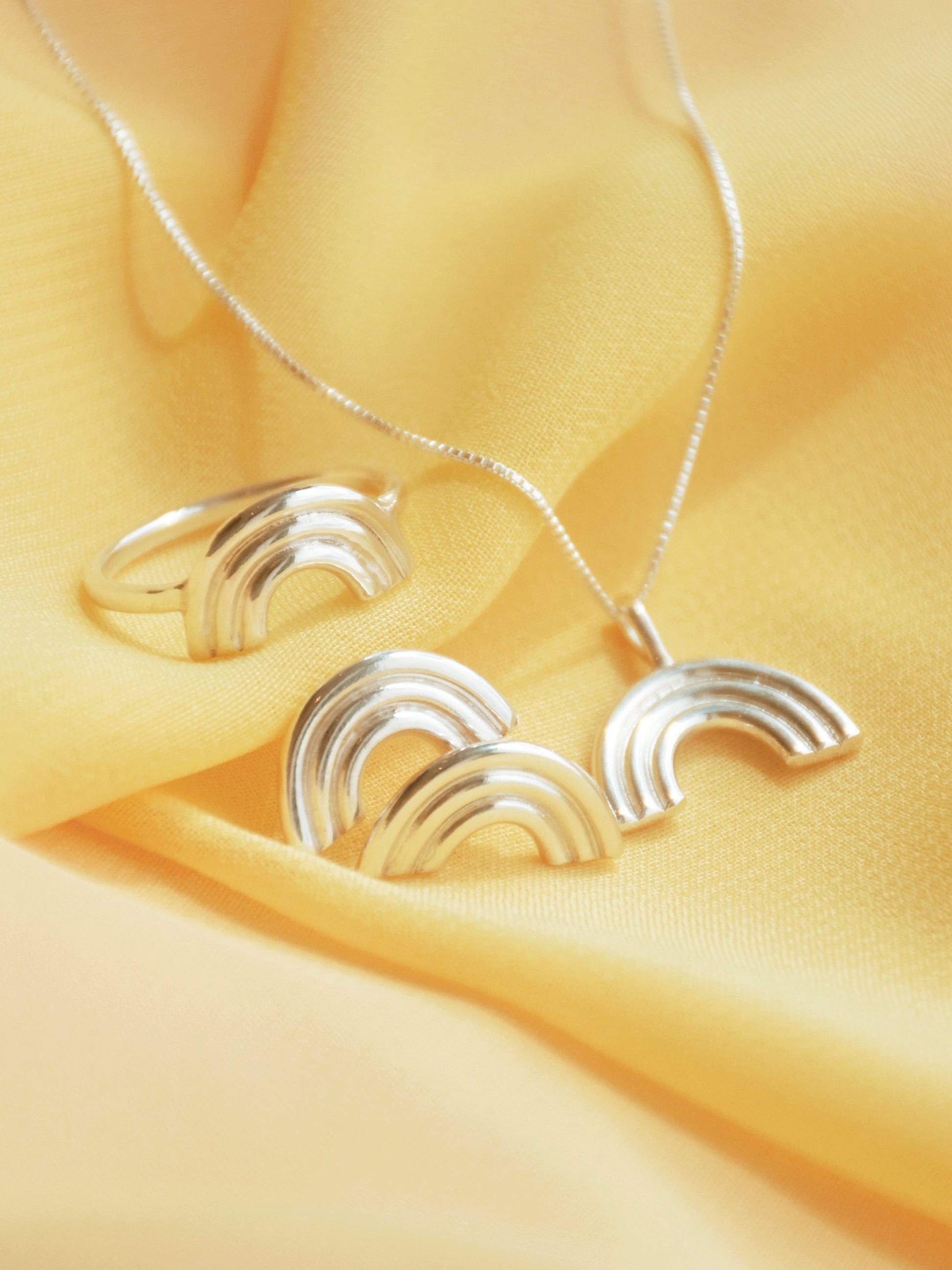 The Rainbow Set brings together three dainty-yet-bold pieces: the Audre Pendant, Sophia Studs, and Ru Rainbow Ring. Each features our signature minimalist rainbow motif—three clean silver arcs that celebrate queerness with quiet strength and playful elegance.