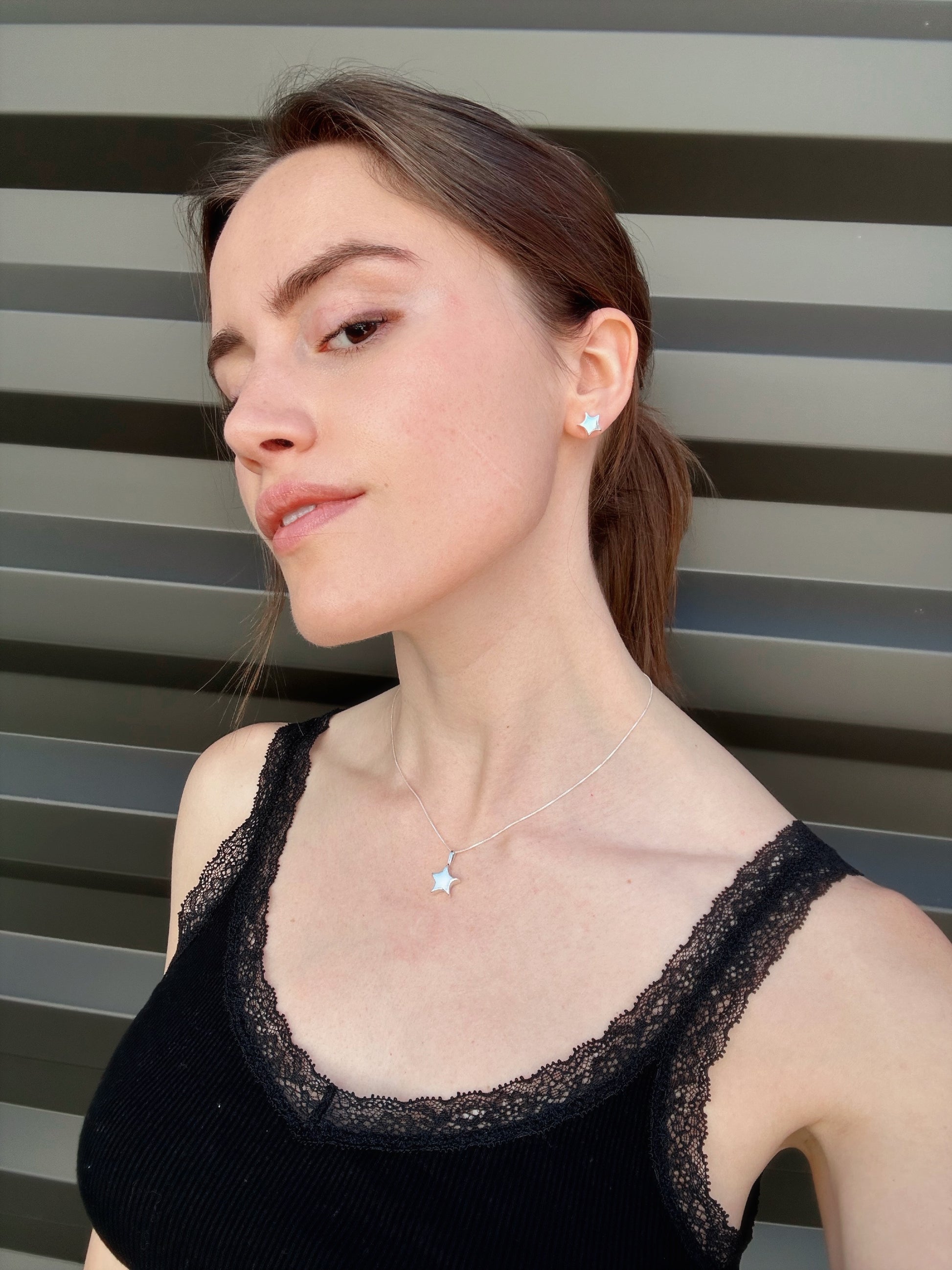 Whether worn together or separately, the Starry Necklace and Starry Studs are playful without feeling overly designed. The necklace features a small hand-sculpted star pendant on a sleek, thin box chain, complemented by matching star accented studs.