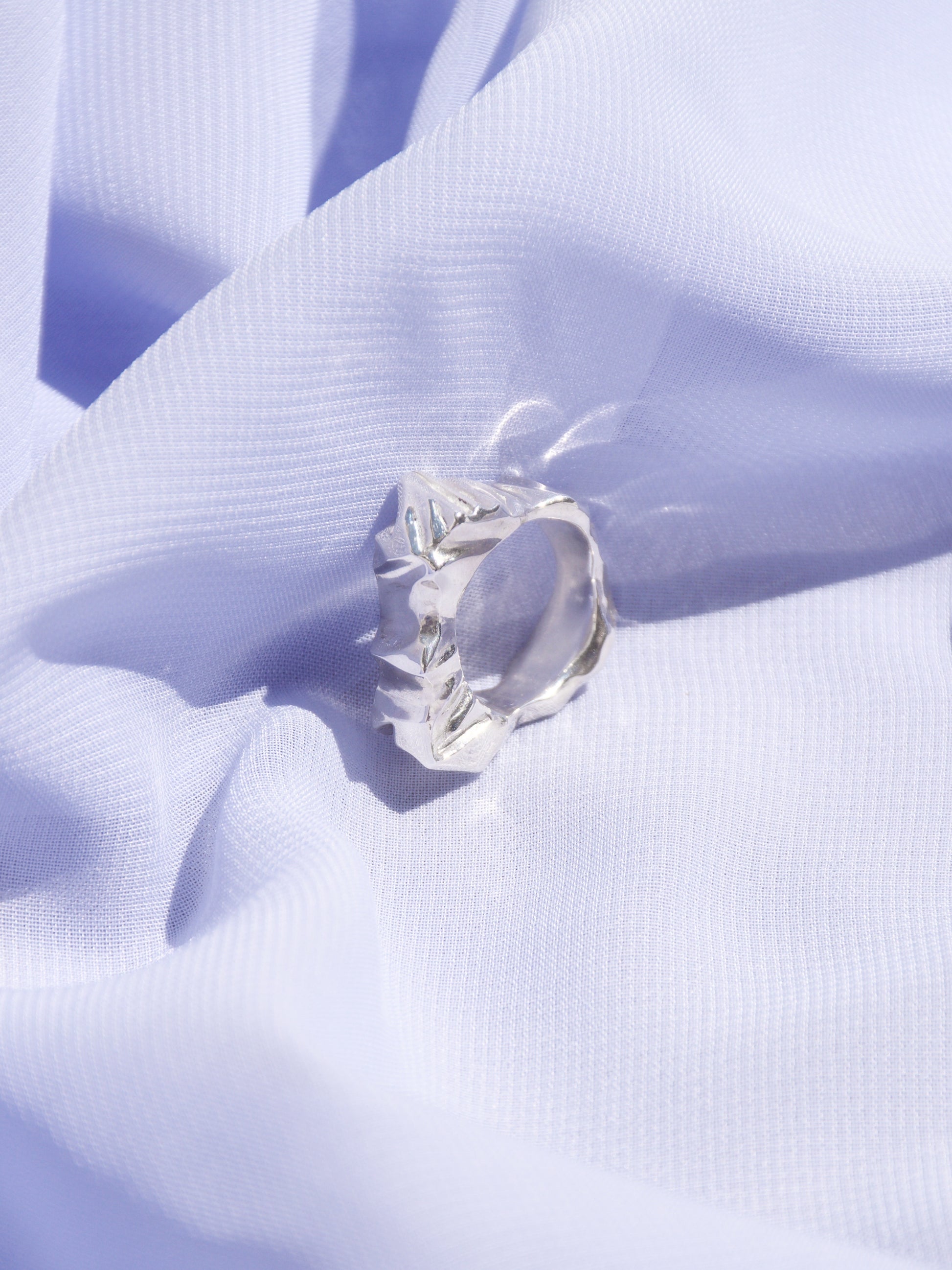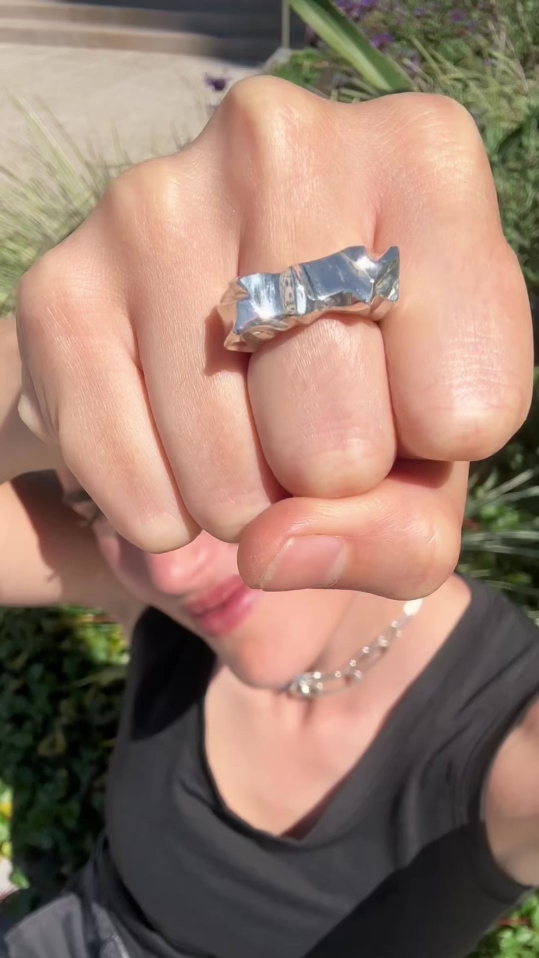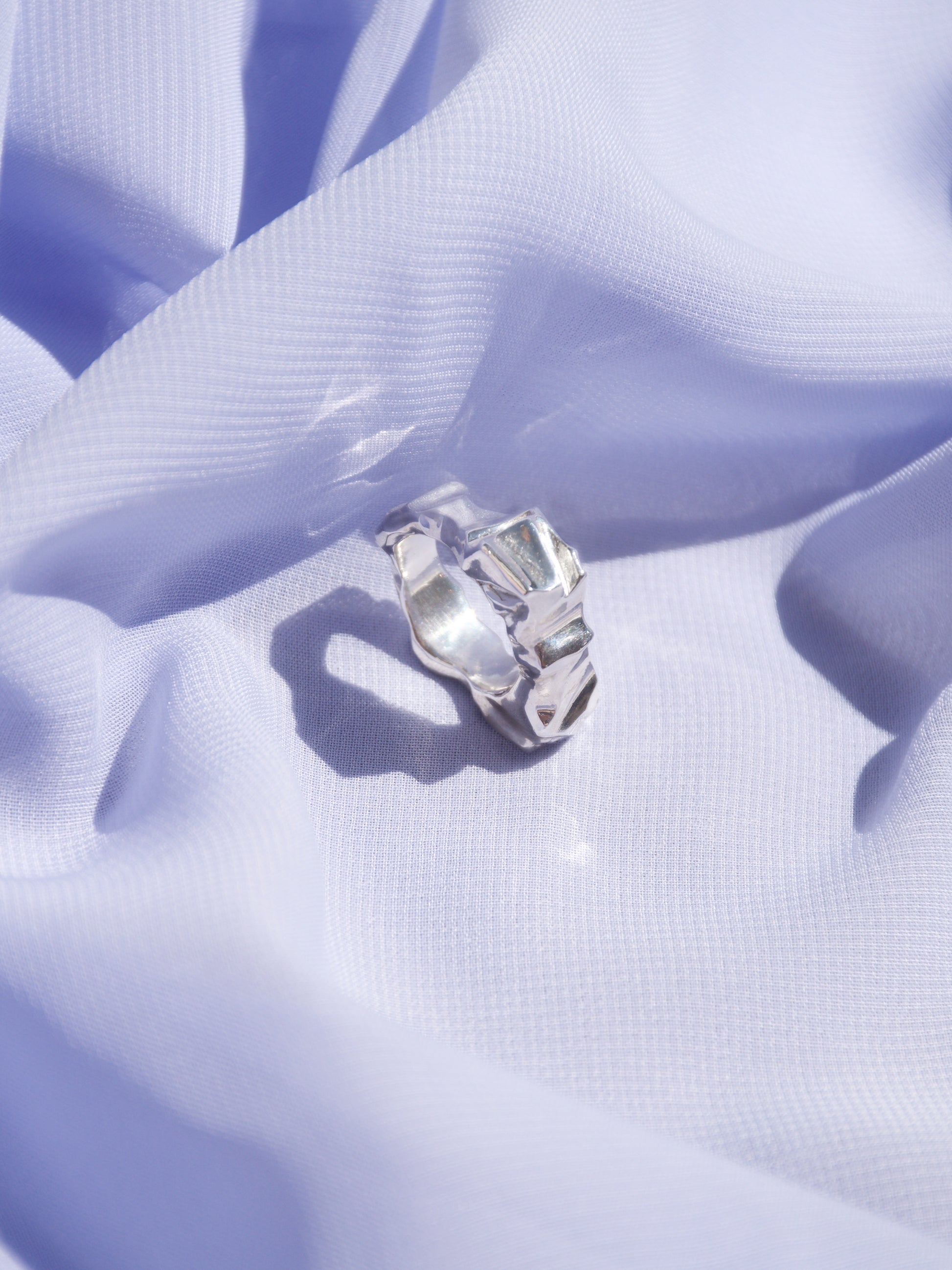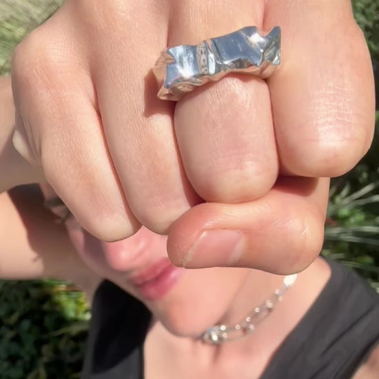 The Glacier Ring commands attention with its sculptural, multifaceted surface that captures and reflects light from every angle. Despite its bold, geometric edges, this piece feels surprisingly smooth and comfortable against your skin, with a satisfying weight that speaks to its solid sterling silver construction. Each ring begins as hand-carved wax, melted and shaped before being cast in sterling silver—ensuring no two are exactly alike. A statement piece that's as unique as you are, with the substantial feel of heirloom-quality jewelry.